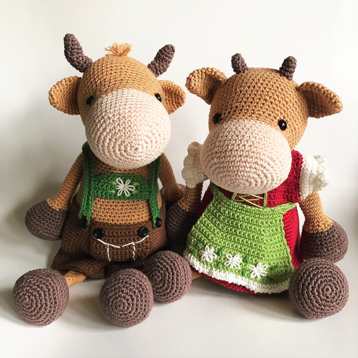 Karsten und Kathi sind etwa 29 cm groß (sitzend ca. 19 cm) und wurden mit einer 2,5-mm-Häkelnadel gehäkelt.
