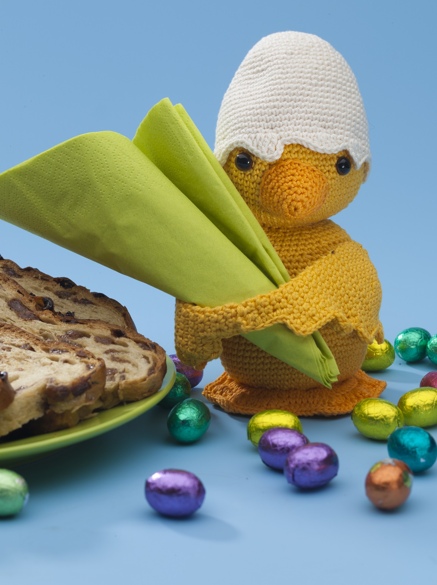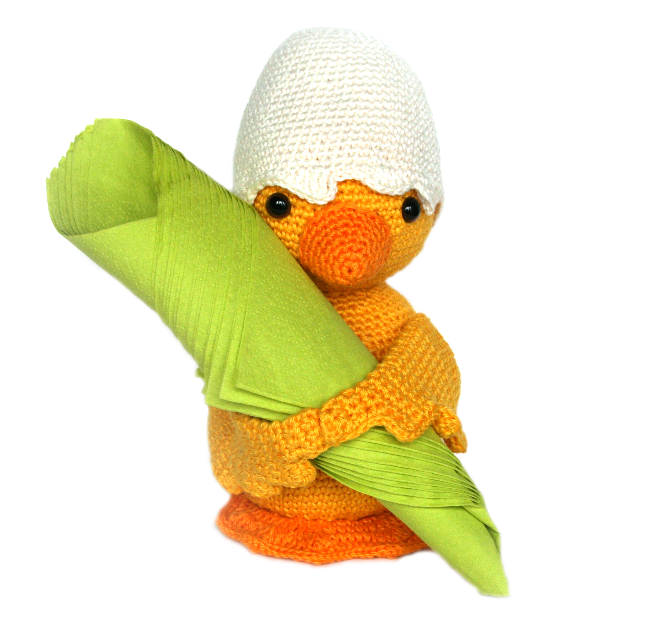 Dieses Küken freut sich schon riesig darauf, bei eurem Osterfrühstück dabei zu sein. Es hat sich gedacht, dass es das am besten kann, indem es sich nützlich macht. Deshalb hält es euch gerne die Servietten.