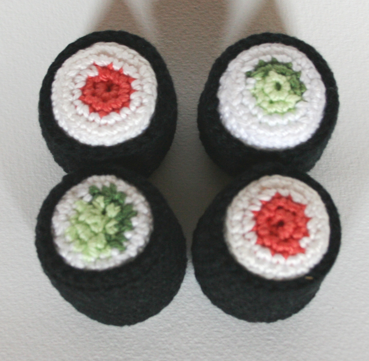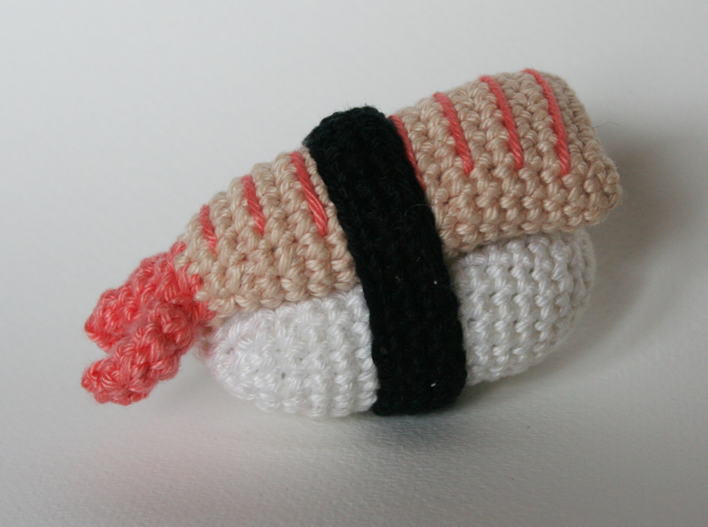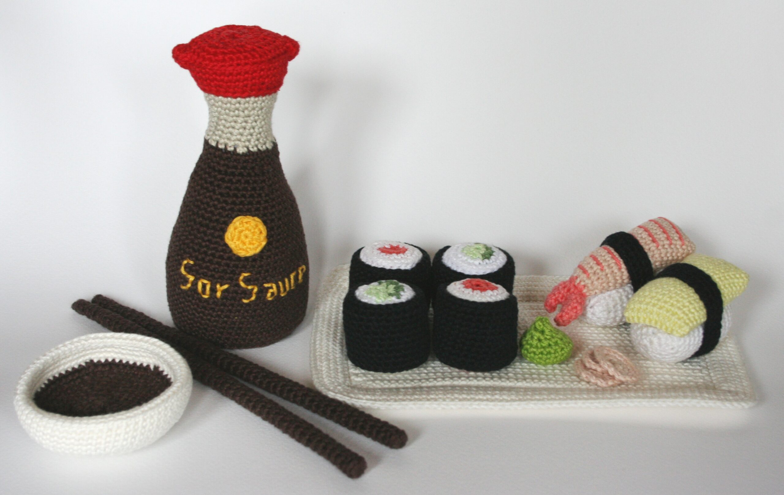 Sojasaucenflasche ca. 14 cm hoch, Teller ca. 20 cm x 12 cm groß, gehäkelt mit Häkelnadel 2,5
