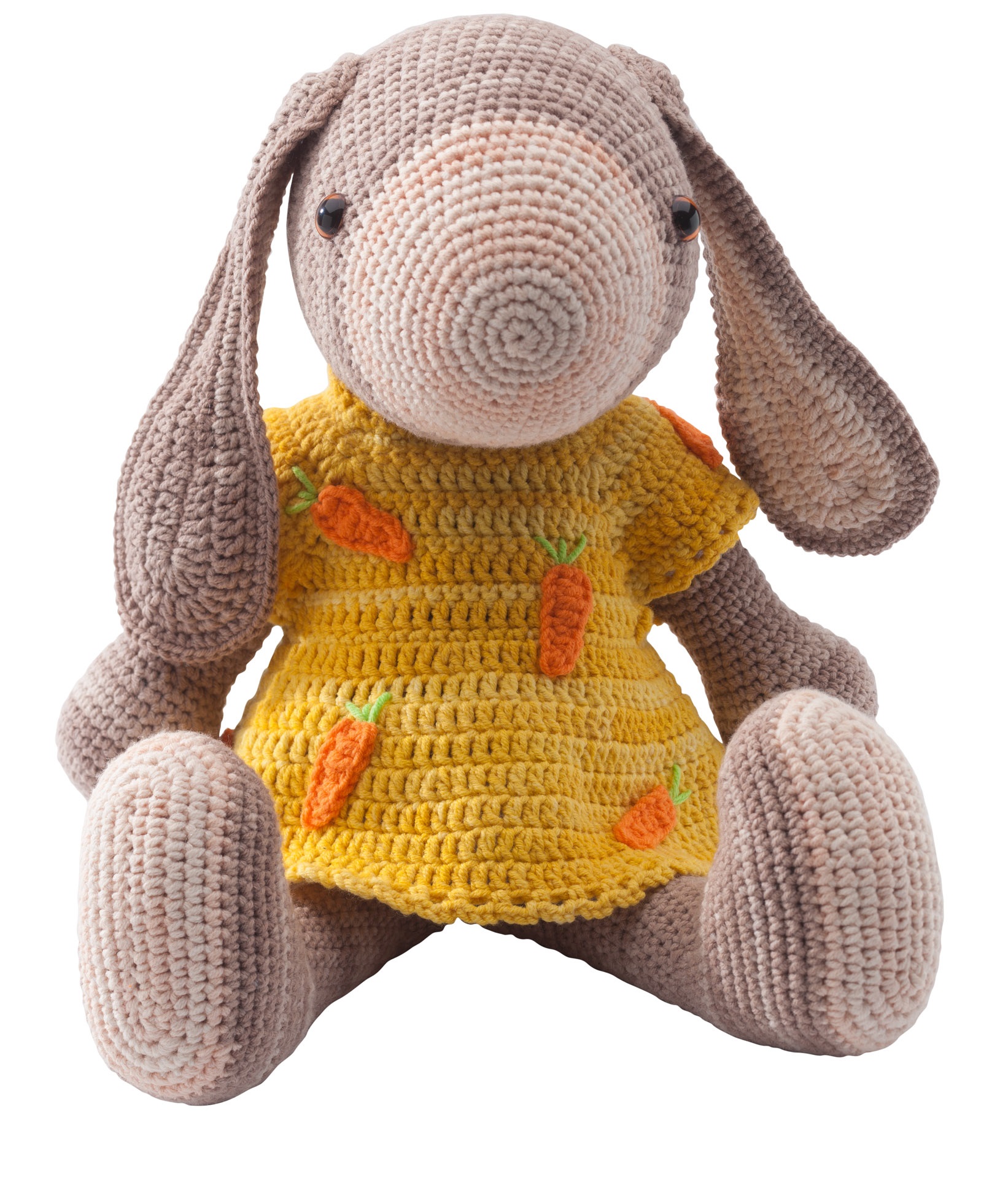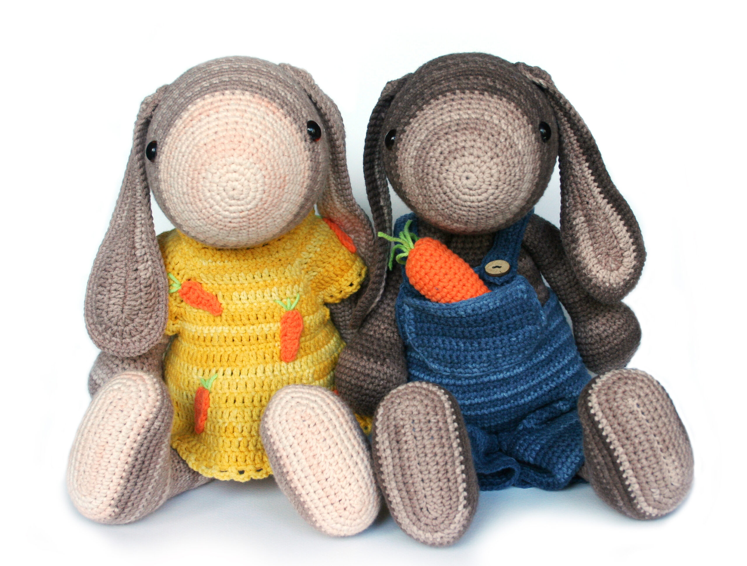 Hanna and Huppel are about 35 cm tall (sitting about 24 cm), crocheted with a size 3 crochet hook