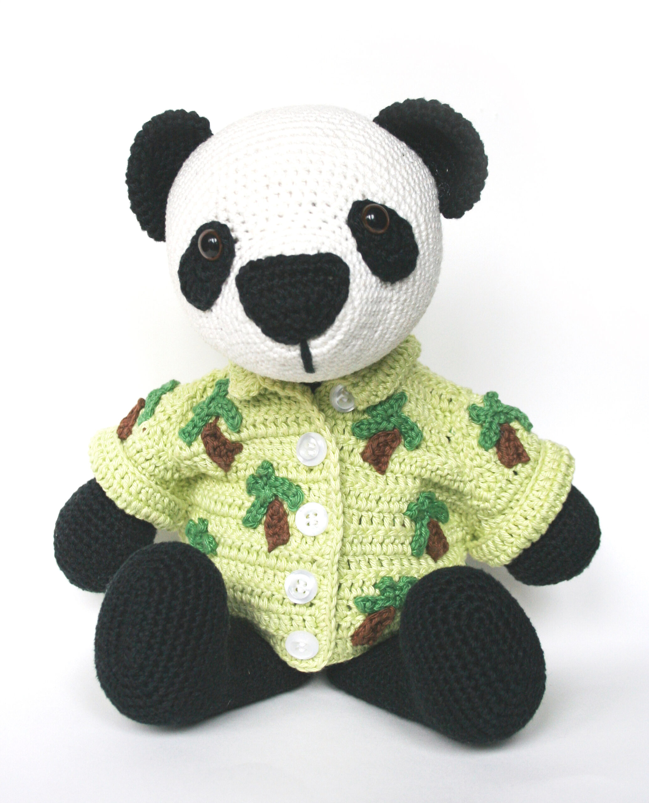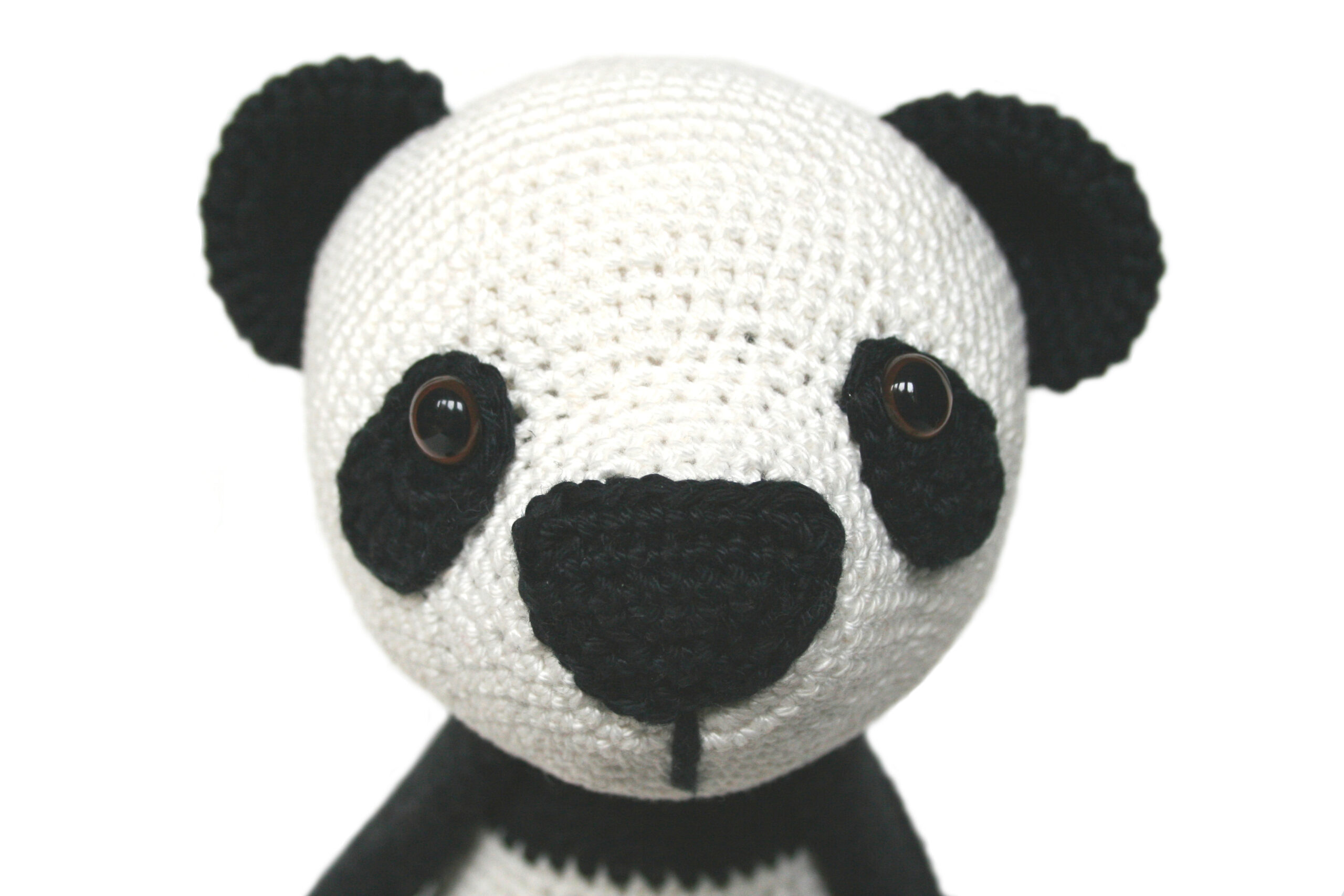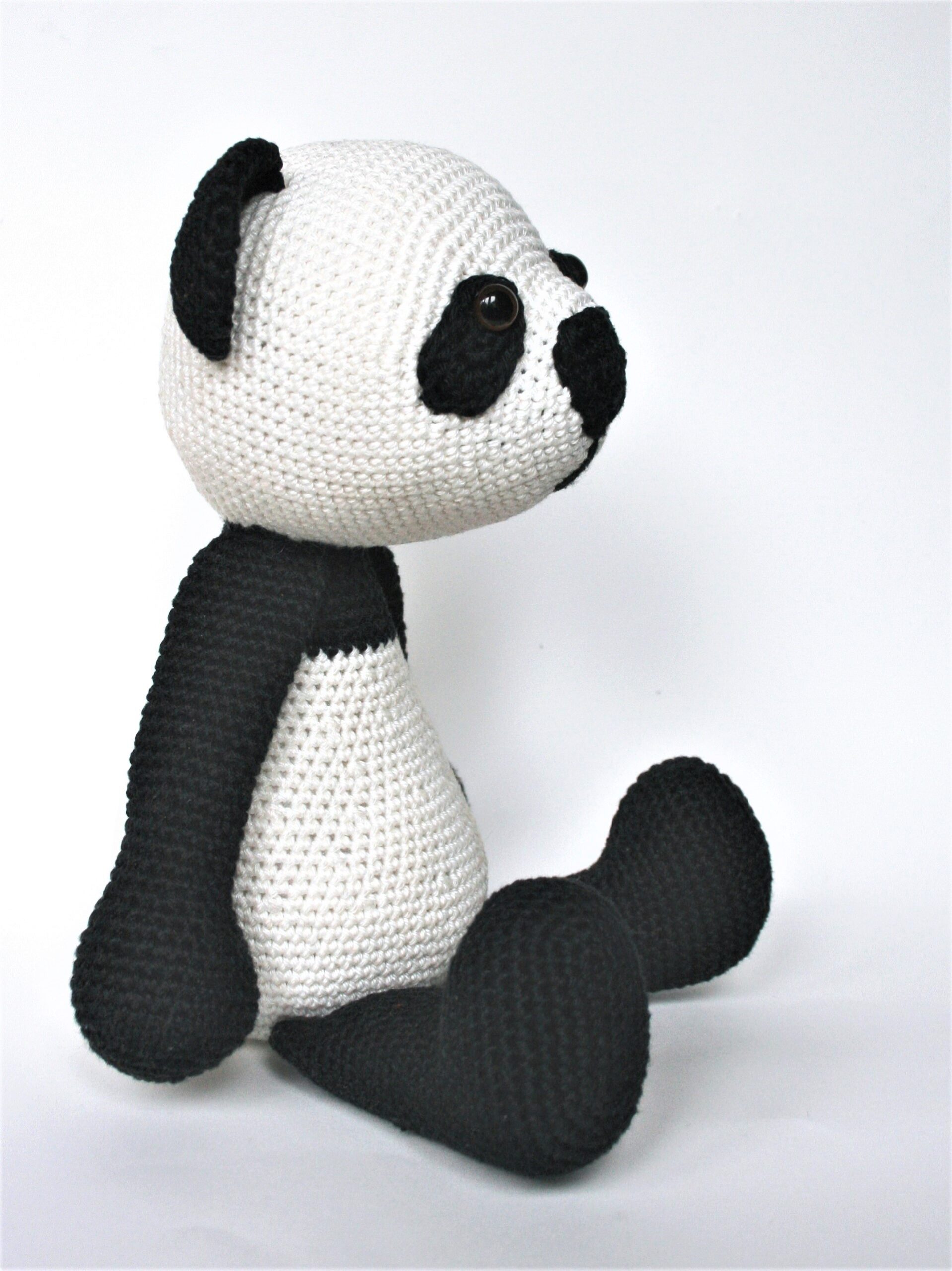 Pelle the Panda Bear is approximately 29 cm tall (sitting approx. 19 cm), crocheted with a 2.5 mm crochet hook