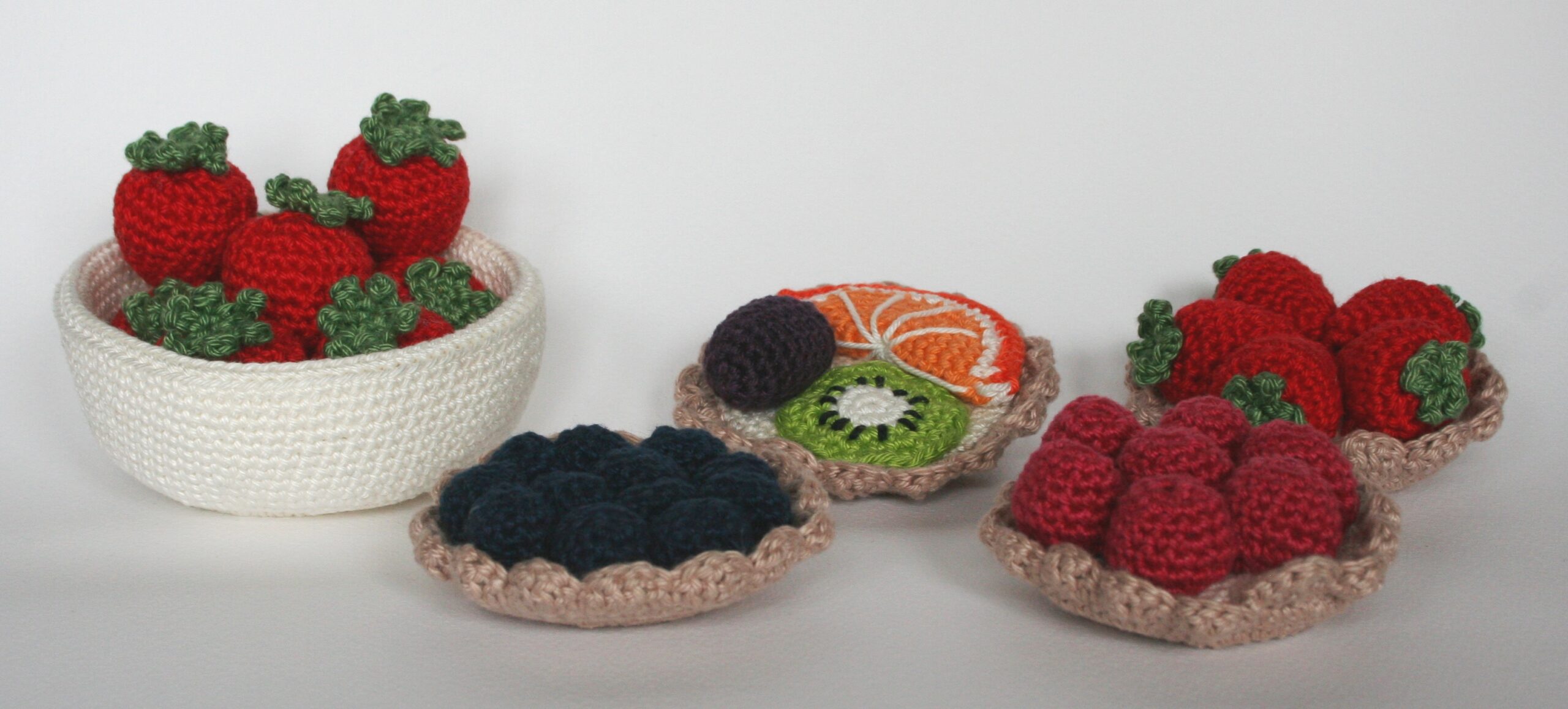 Deze set bevat de patronen van de 4 verschillende fruittaartjes, de aardbeien en het schaaltje