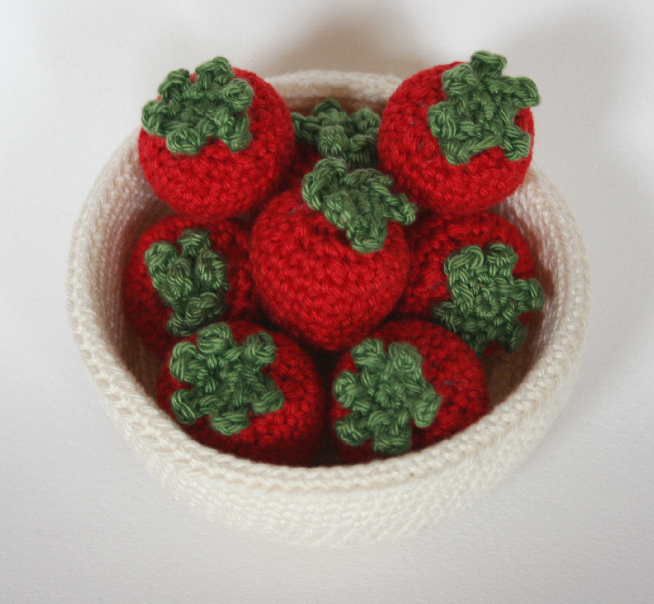 Doorsnede taartje ca 7 cm, schaaltje aardbeien ca 10 cm, gehaakt met haaknaald 2,5