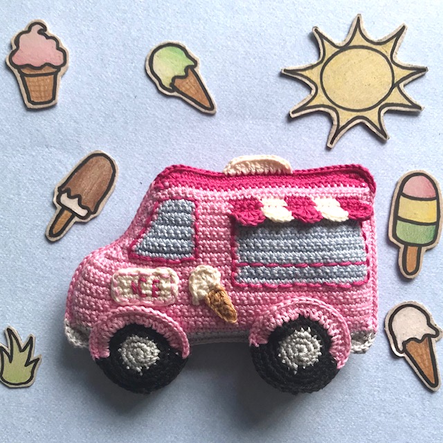 De ijswagen wordt ongeveer 18 cm lang en 11 cm hoog, gehaakt met haaknaald nr. 2,5
