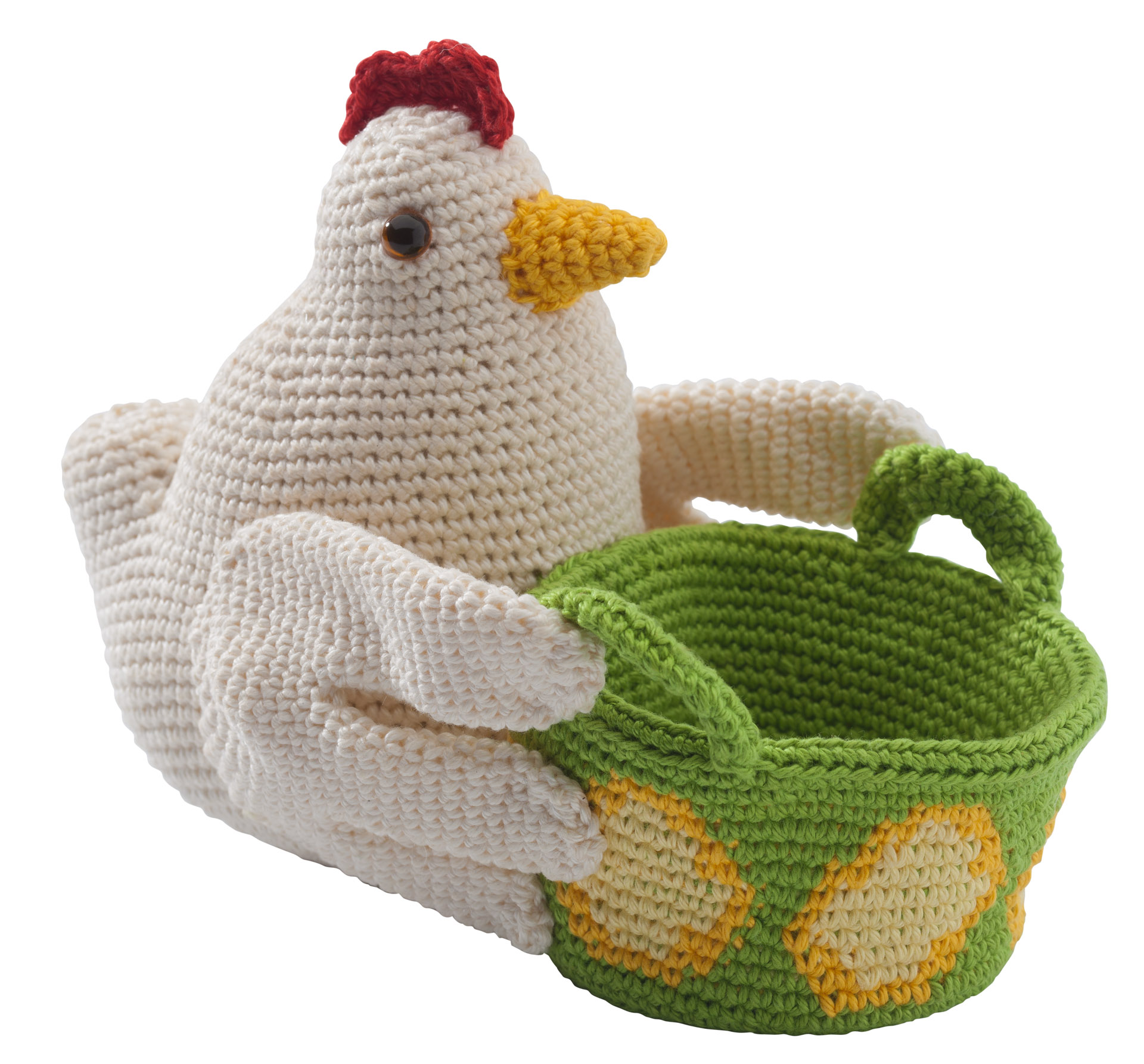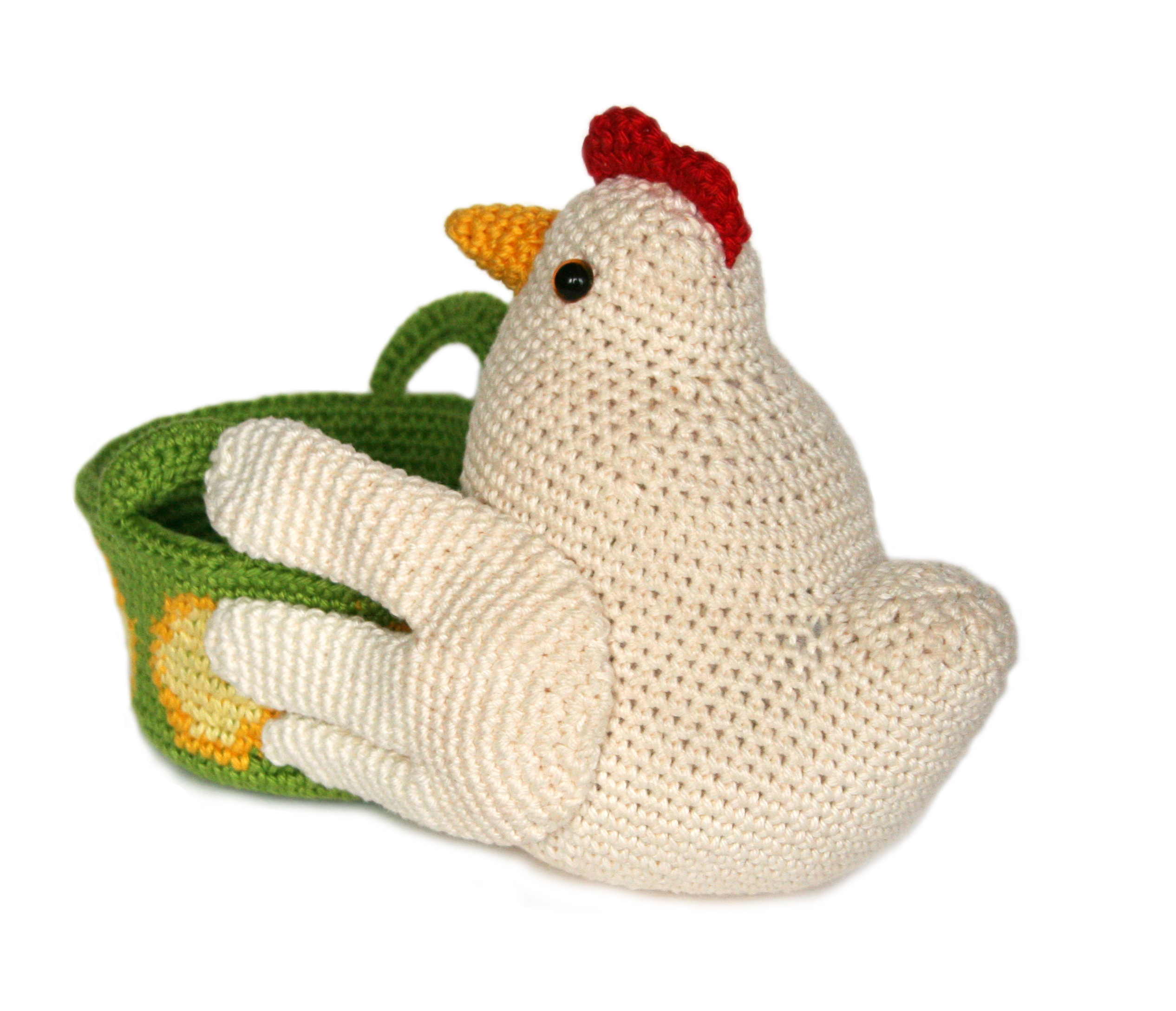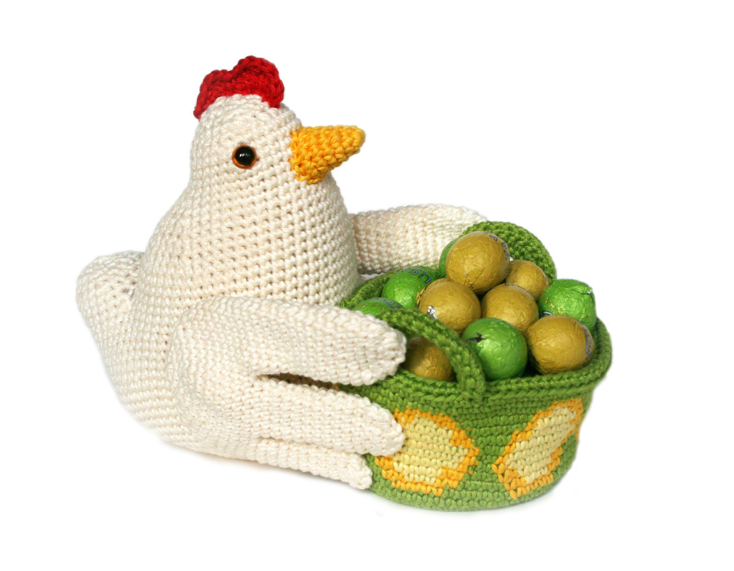 Wat is er nu een leukere plek om je chocolade eitjes te bewaren dan een zelf gehaakt mandje? En Kaatje de kip houdt het mandje graag voor je vast.