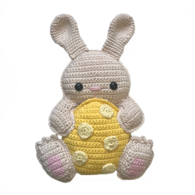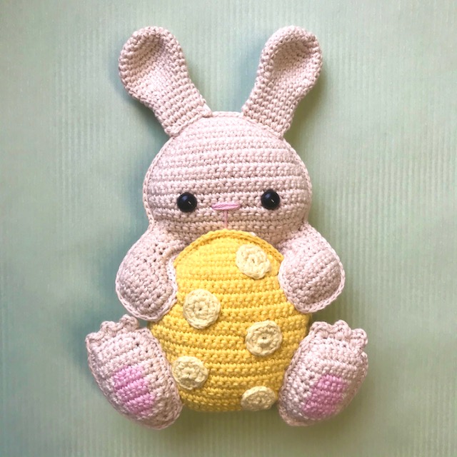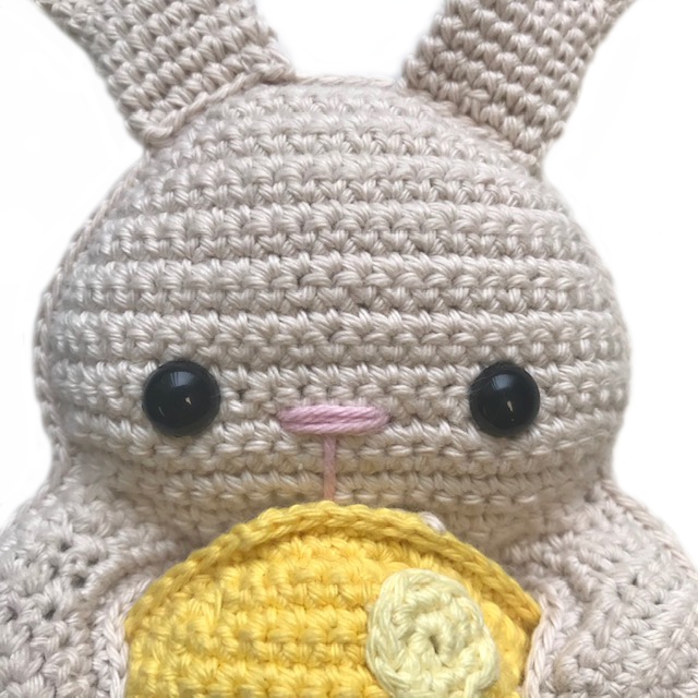 Het haasje wordt ongeveer 20 cm hoog, gehaakt met haaknaald nr. 2,5