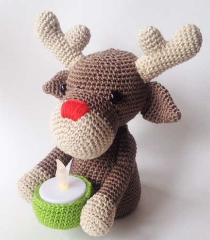 Het rendiertje wordt ongeveer 16 cm hoog, gehaakt met haaknaald nr. 2,5