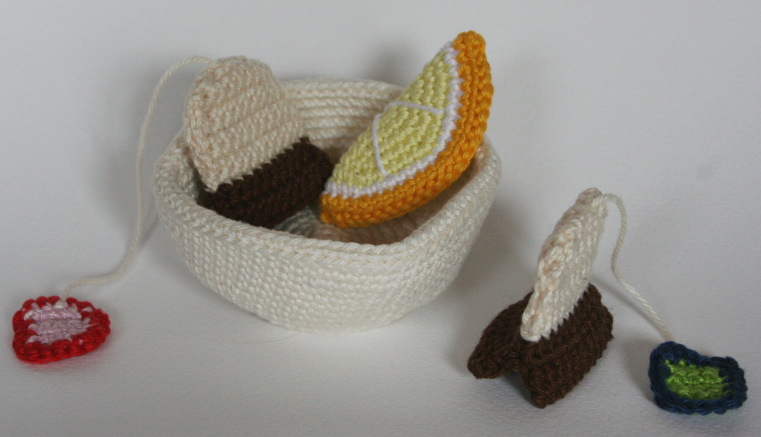 Hoogte theepot: ongeveer 16 cm, kopje ca 6 cm gehaakt met haaknaald 2,5